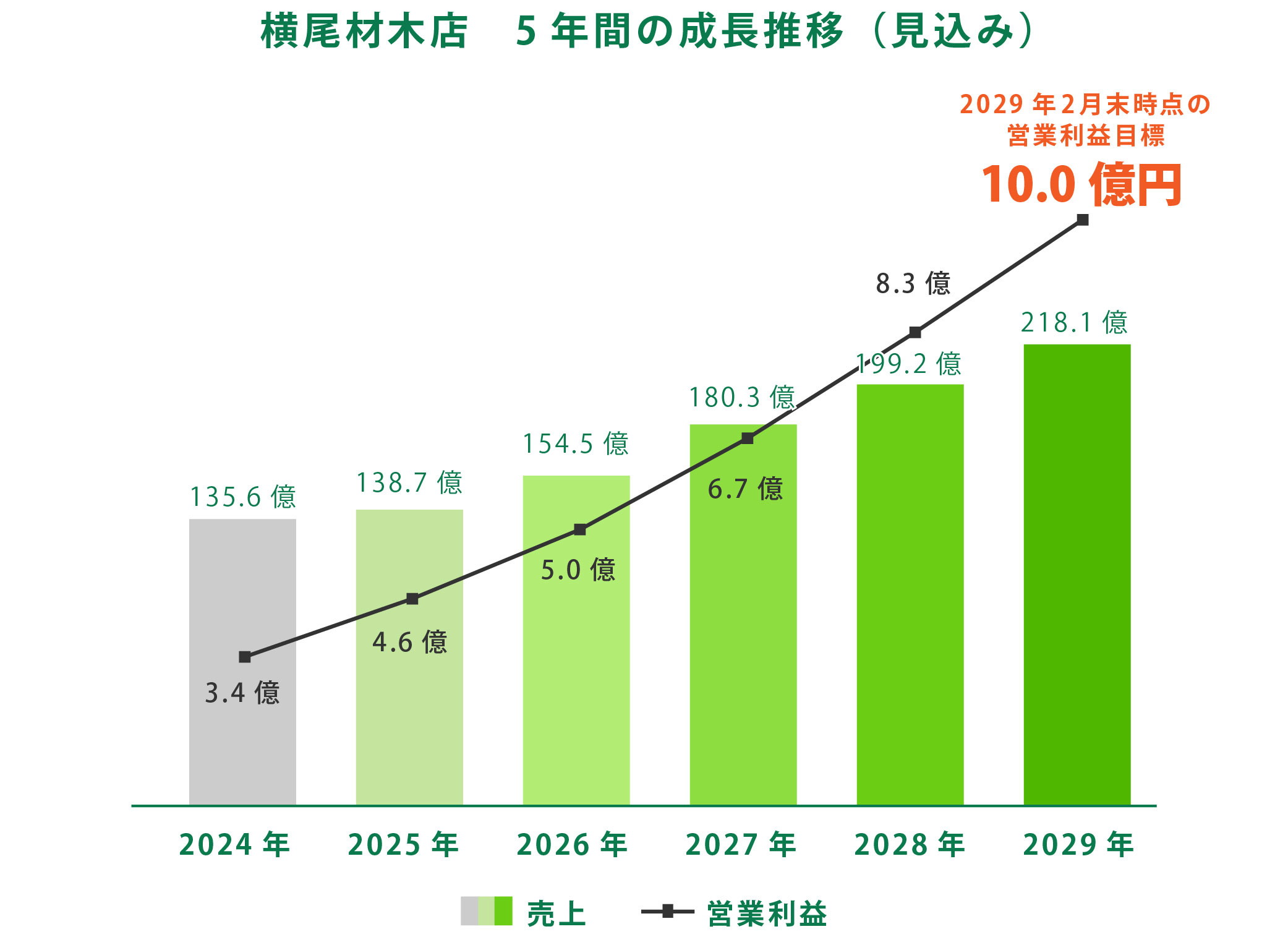 横尾材木店では、2024年から2029年の中期経営計画として、開始から5年後に営業利益10億円を達成する「5か年計画」を策定しました。