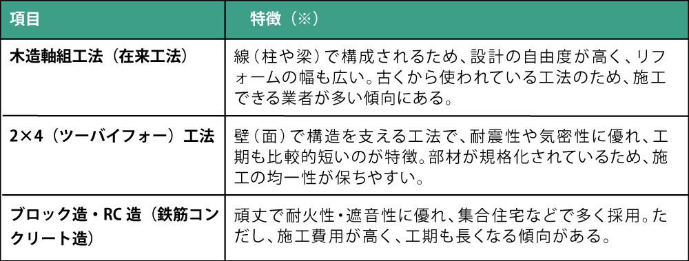 また、木造には主に木造軸組工法(在来工法)や2×4(ツーバイフォー)工法などの種類があり、それぞれの特徴は以下の表のとおりです。