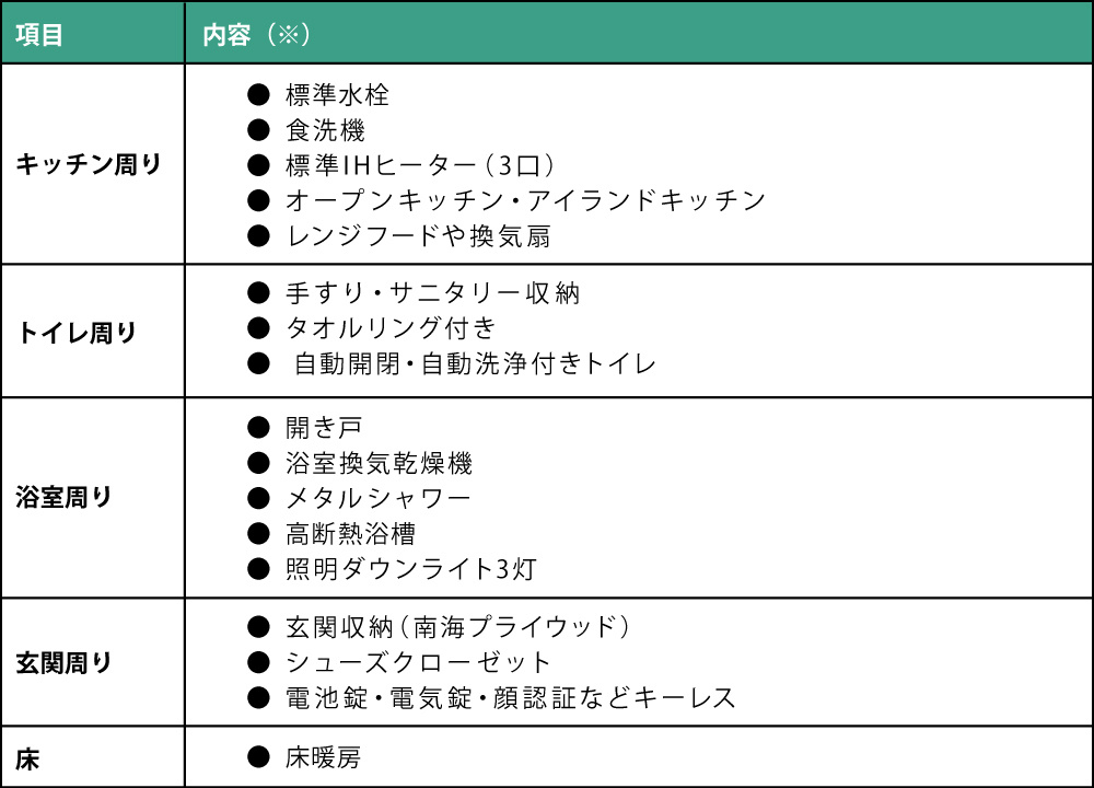 以下は、注文住宅の標準仕様に含まれる項目をまとめた表です。