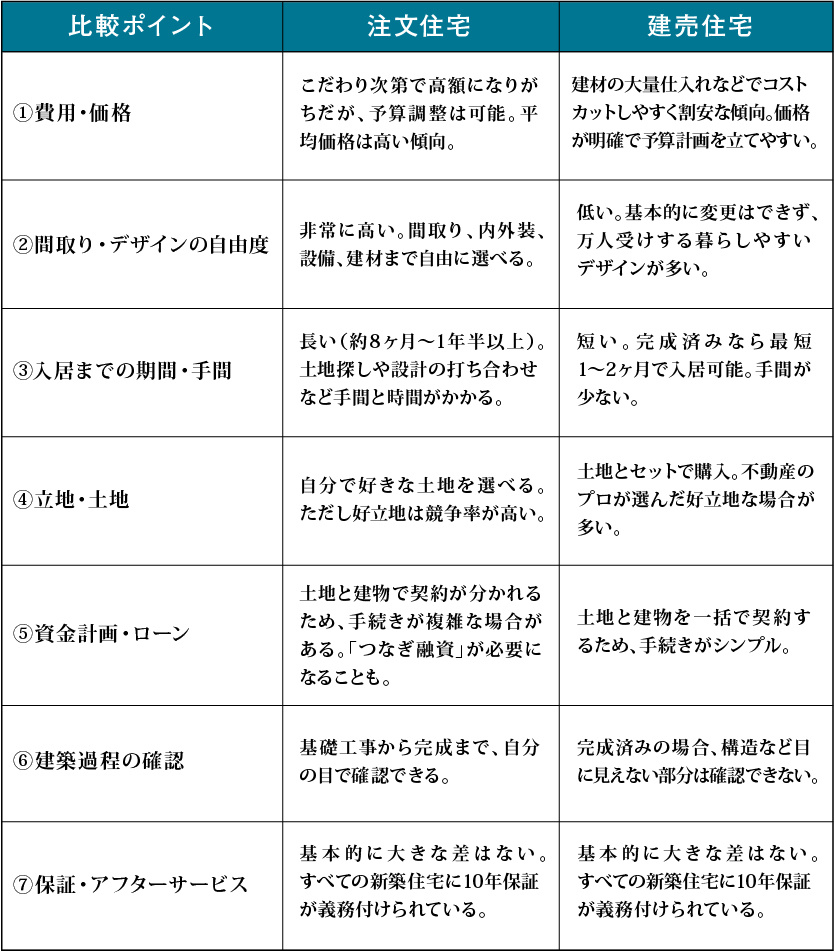 それでは、具体的な7つのポイントで注文住宅と建売住宅を比較していきましょう。どちらがご自身の希望やライフプランに適しているか、じっくりとご検討ください。
