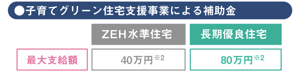 ※2…既存住宅撤去がない場合の金額です。既存住宅撤去がある場合、ZEH水準住宅の補助金は合計60万円・長期優良住宅の補助金は合計100万円になります。