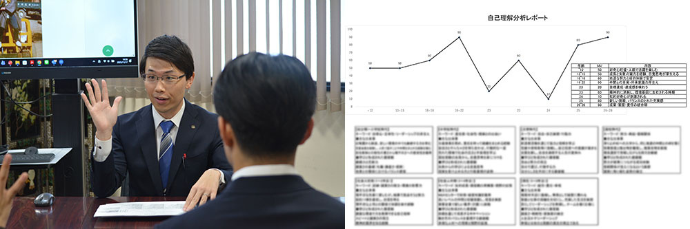 内定者には事前課題として「ライフウェイクシート」を作成してもらい、これまでの人生でのモチベーションの変化や転機を振り返りました。専務自身も同じワークを実施し、幼少期〜現在に至るまでの経験を共有。