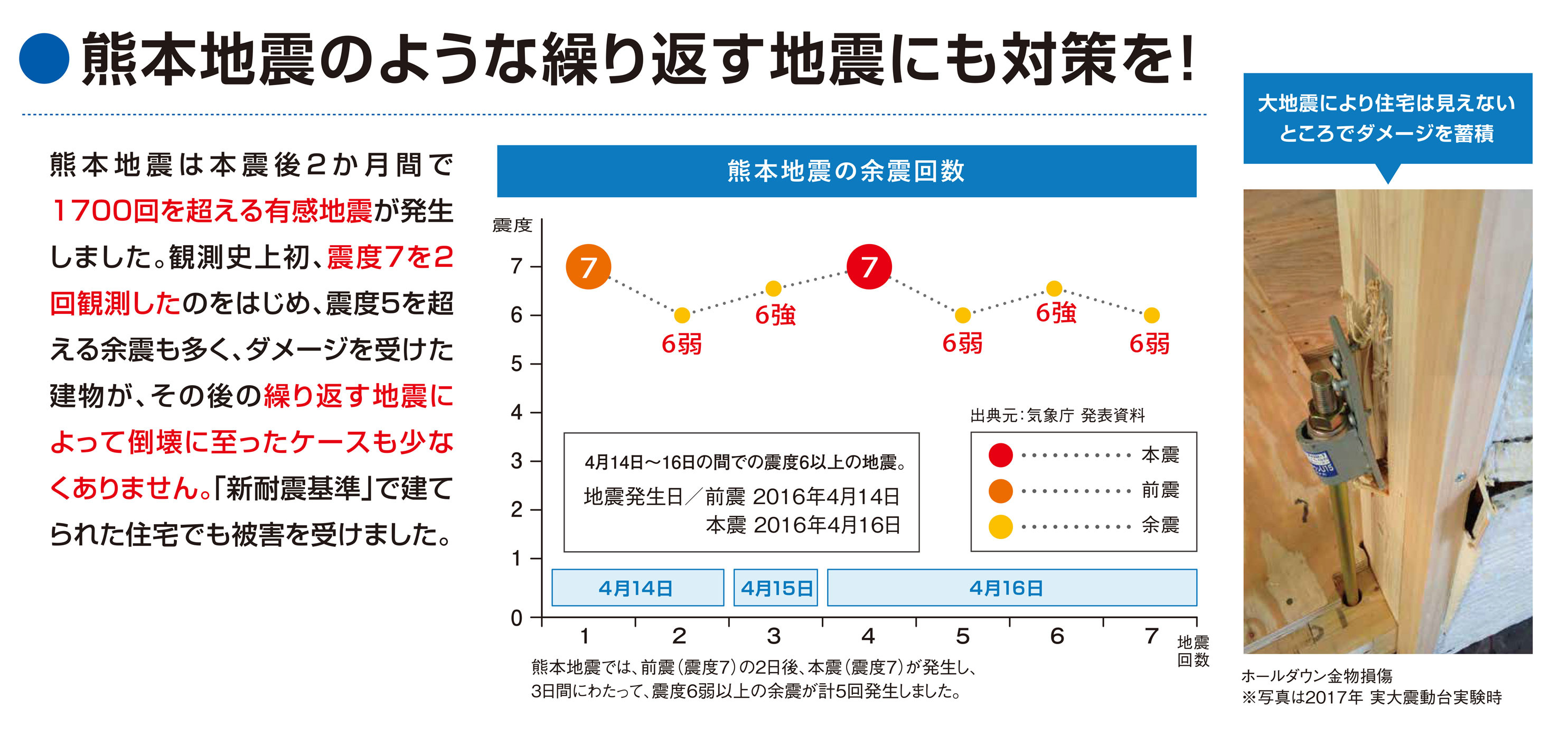 本震のあとも余震が続き、建物に少しずつダメージが蓄積していくケースもあります。耐震性能による「倒れにくさ」に加え、揺れそのものを抑える仕組みを組み合わせることで、住まいへの負担を軽減する。
