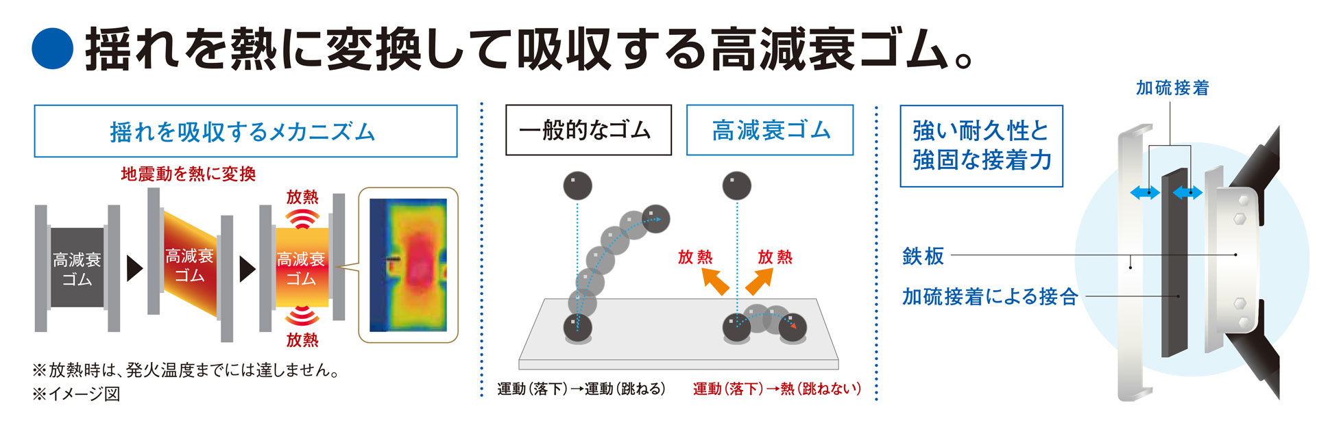 地震によって建物が揺れる際、そのエネルギーをゴムが吸収し、熱に変えて逃がすことで、建物の揺れを抑える仕組みです。