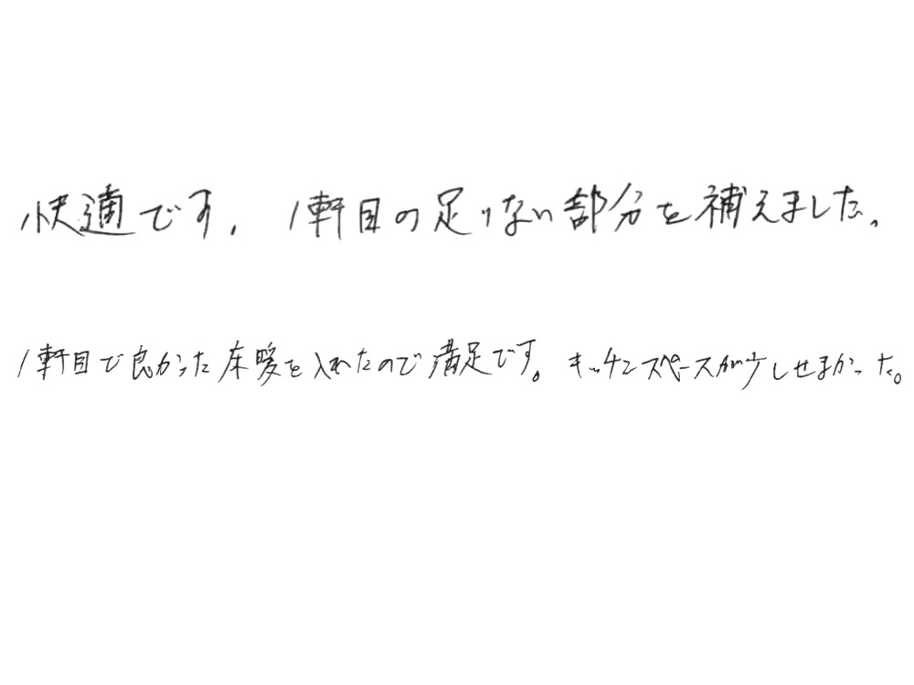 1軒目で良かった床暖を入れたので満足です。キッチンスペースが少しせまかった。