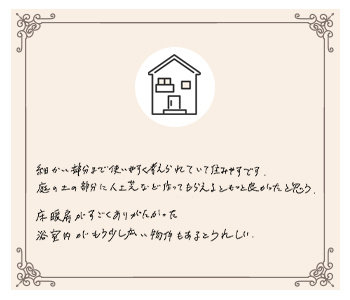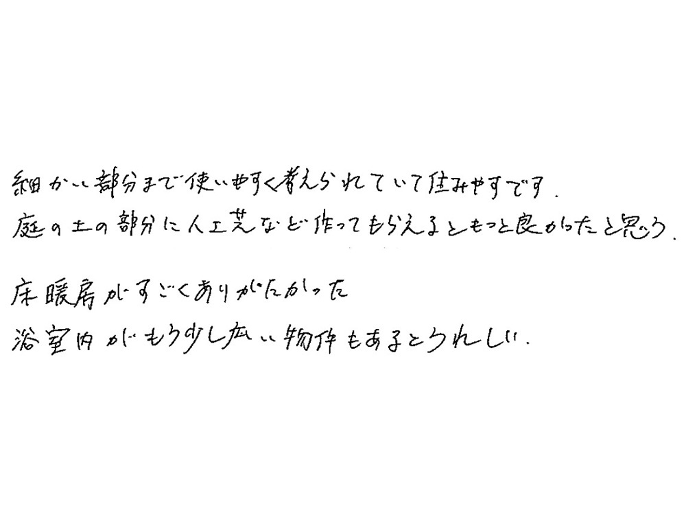 庭の土の部分に人工芝など作ってもらえるともっと良かったと思う。