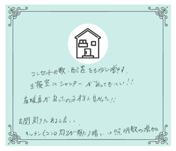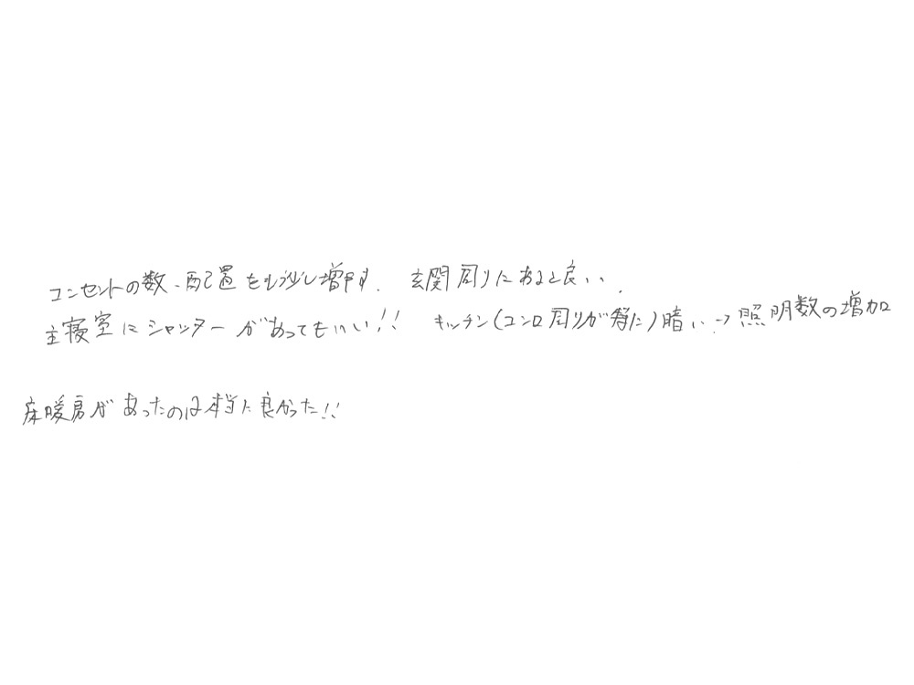 コンセントの数、配置をもう少し増やす、玄関周りにあると良い。
