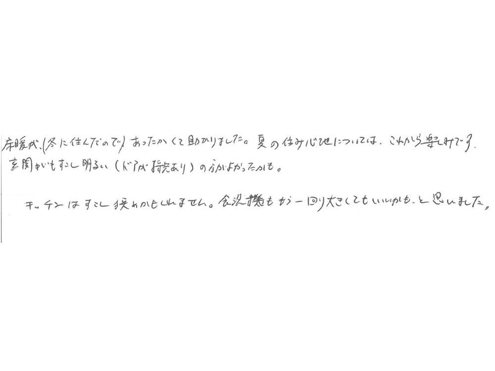 床暖が(冬に住んだので)あったかくて助かりました。夏の住み心地については、これから楽しみです。